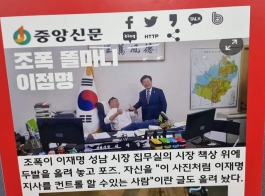 - 이재명은 성남시장 시절, 시장 집무실을 대중에게 공개하고 성남시민들이 언제든 와서 사진도 찍을 수 있도록 했는데, 이중 사진을 찍은 사람 중 한 명이 조폭이네 뭐네 하면서 논란이 된 것으로 보인다. (실제로는 영어강사임)