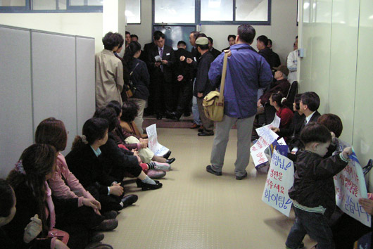 - 이에 반발하여 이재명 변호사는 성남시의회에서 위 사진처럼 항의를 했는데, 한나라당은 이를 특수공무집행방해혐의로 고발했고, 당시 공공병원 만들기 운동의 대표였던 이재명 변호사가 구속되게 됐는데, 이를 피하기 위해 도망을 가게되면서 수배되고 전과기록이 생기게 된다.